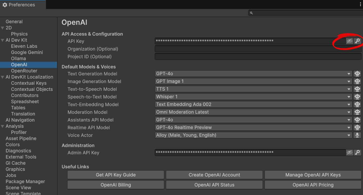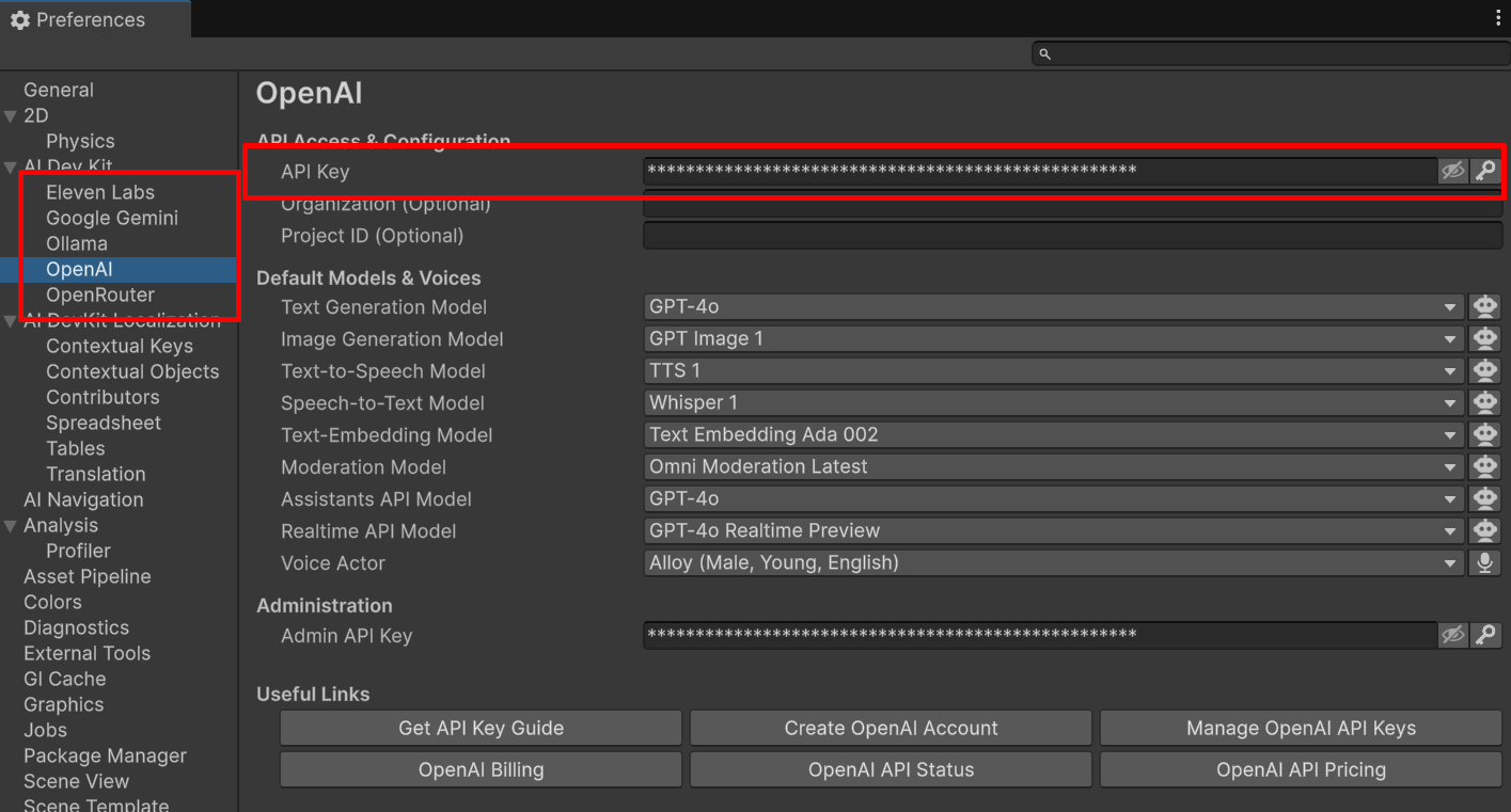 Go to **Edit > Preferences > AI Dev Kit > \[Each Provider Tab]**\